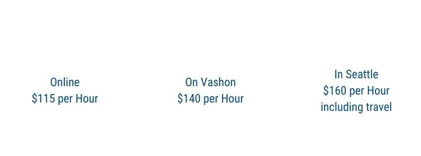 Private sessions may be conducted via Zoom, at my private office on Vashon Island in the Tree of Life Wellness Center, or around the Seattle area as time and studio space is available. Book an appointment or free consultation below.